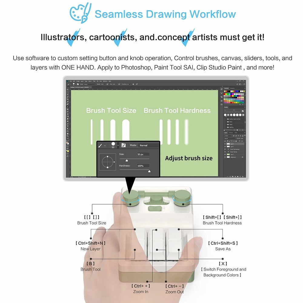 - Use software to custom setting buttons and knob operation, control brushes, canvas, sliders, tools, and layers with one hand. Apply to Photoshop, Paint Tool SAl, Clip Studio Paint, and more