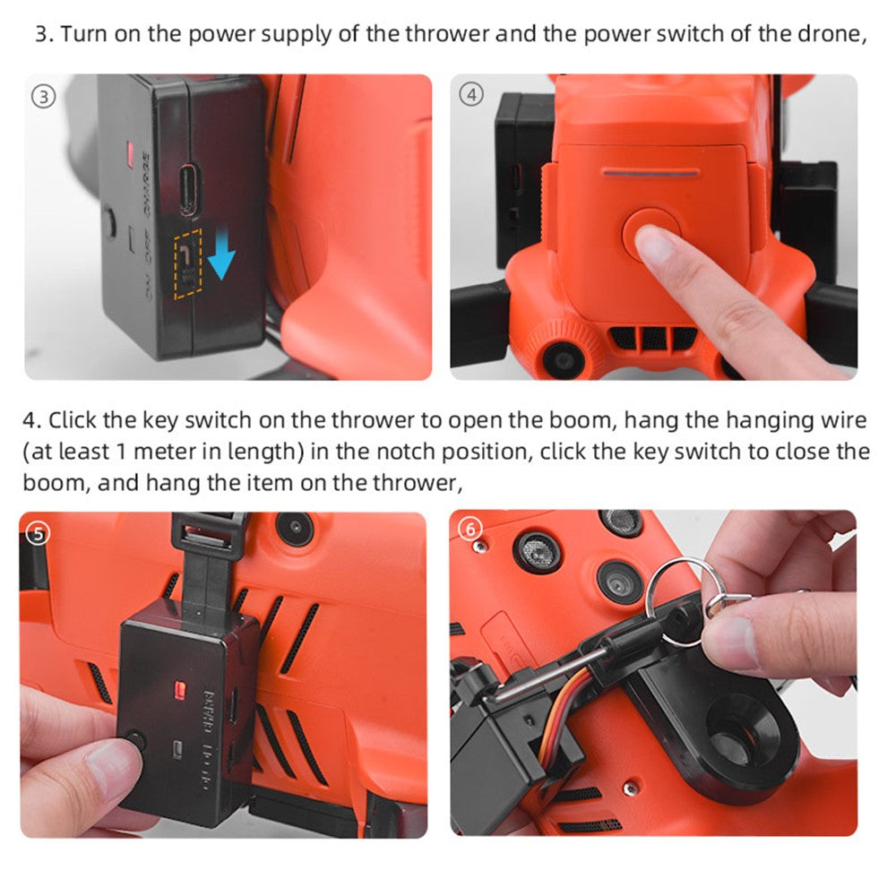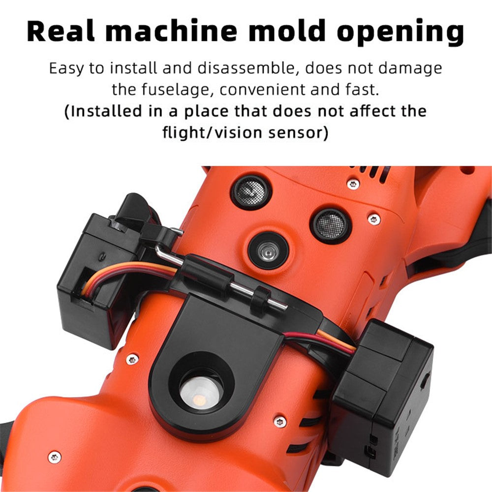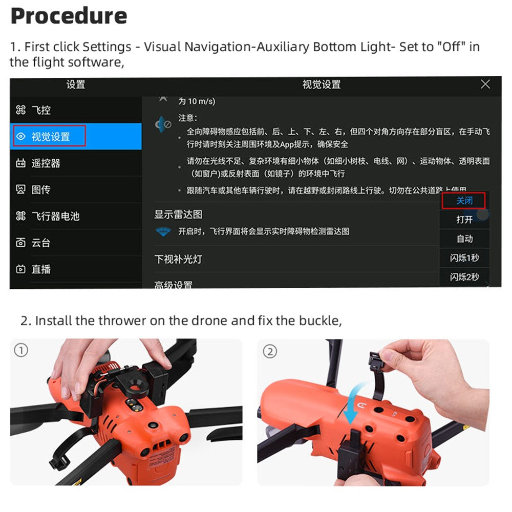- Lightweight and safe, tailor-made according to the drone shell, easy to install and disassemble. Control the opening and closing of the thrower by using the opening and closing of the UAV's downward-looking supplementary light