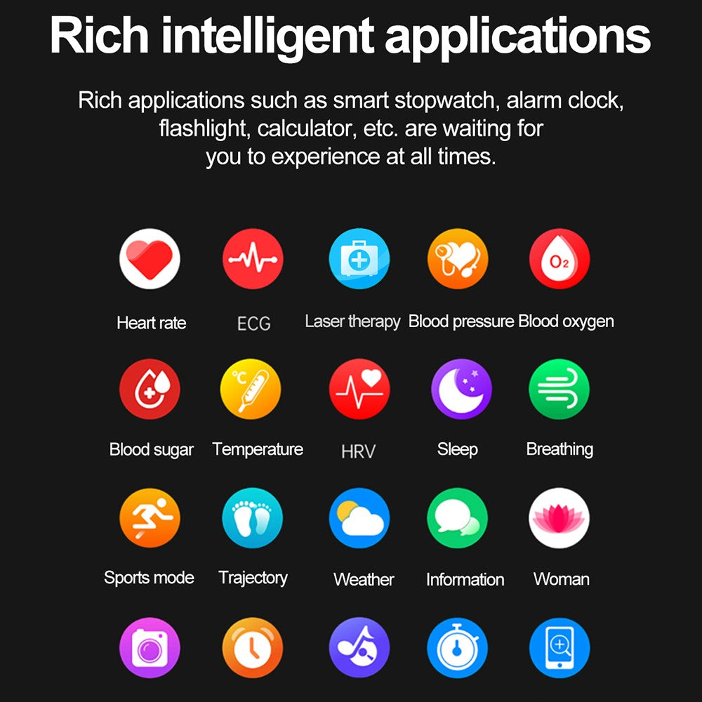 Special Features | Laser therapy+ECG electrocardiogram function+communication+high-end health management watch for blood lipids, uric acid, blood glucose; HRV-AI medical diagnosis, temperature monitoring, blood oxygen monitoring. Laser therapy, non-invasive blood glucose measurement, uric acid measurement, blood lipid monitoring, blood pressure monitoring; Bluetooth-compatible call function for remote care of female physiological health and family and friends; The watch has the function of laser therapy, optimizing blood lipids, blood glucose, and blood pressure, improving blood microcirculation, and preventing cardiovascular and cerebrovascular diseases Blood sugar, blood lipids, uric acid, body temperature, blood pressure, blood oxygen, sleep monitoring, respiratory training, and other health functions are constantly monitored, providing you with all-weather health protection |