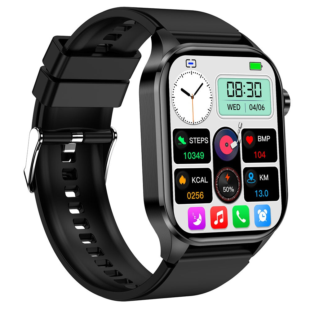 Function points | ECG electrocardiogram function, 2.04-inch super retina 368 * 448 full touch screen, Bluetooth-compatible communication, non-invasive blood glucose measurement, blood composition measurement (uric acid and lipid function), body composition BMI body fat measurement, HRV function, AI medical diagnosis, Mett function, SOS emergency call function, temperature monitoring, blood oxygen monitoring, blood pressure monitoring, respiratory training, pressure monitoring, female health (menstrual tracking), heart rate monitoring, blood pressure monitoring, sleep monitoring Long sitting reminders and other health functions. Step/Calories/Distance, Multi Sport Mode, alarm clock, Screen Display, Weather Forecast, Intelligent Voice Assistant, Games, Flashlight, Music Playback and Control, APP: Hband. |
