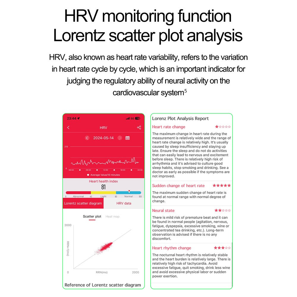 - HRV Monitoring Function: HRV, also known as heart rate variability, refers to the variation in heart rate cycle by cycle, which is an important indicator for judging the regulatory ability of neural activity on the cardiovascular system