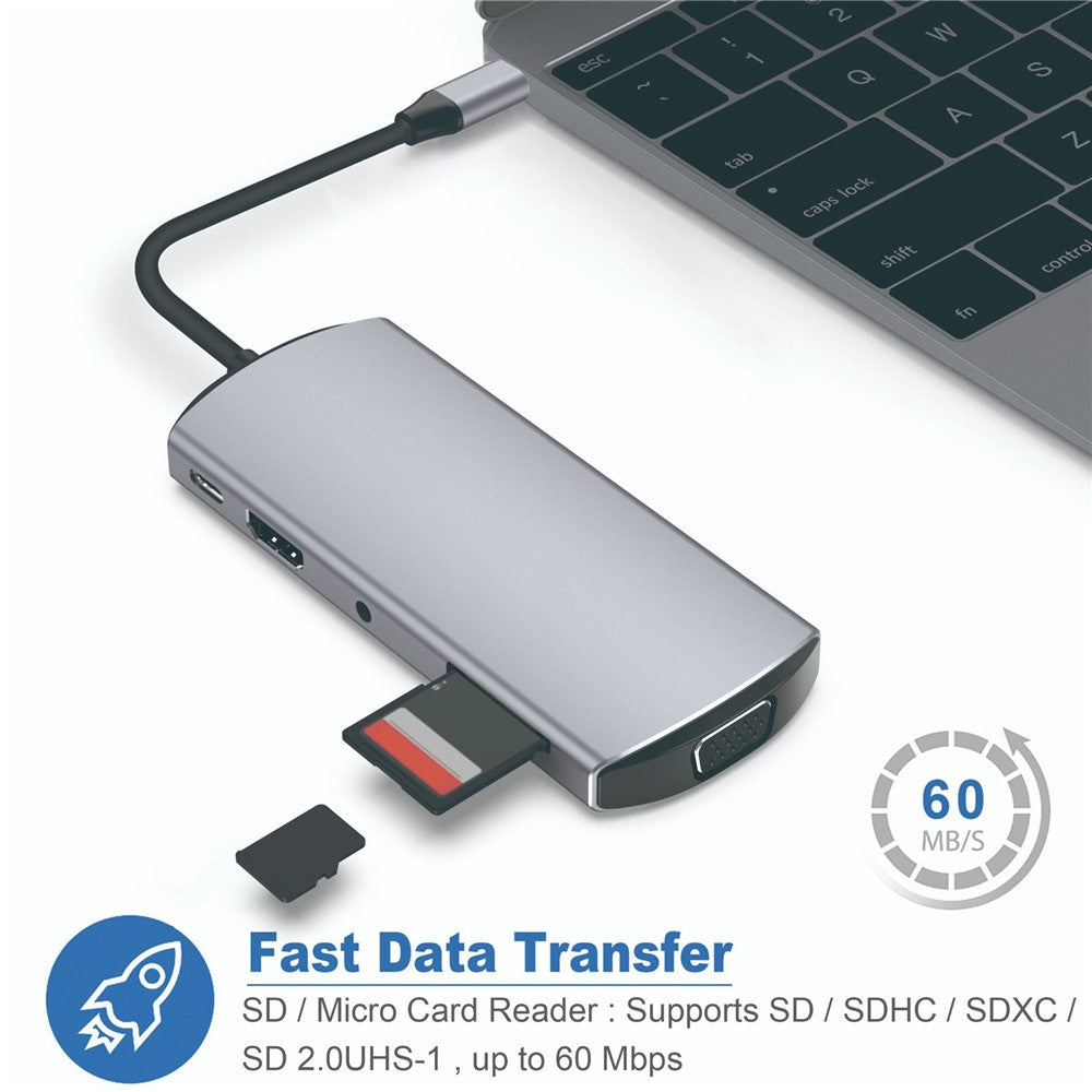 - 9-in-1 Type-C Hub with Comprehensive Expansion: Features 9 ports, including USB-C, 3xUSB3.0, 4K HD, VGA, SD/TF card slots, and a 3.5mm audio jack