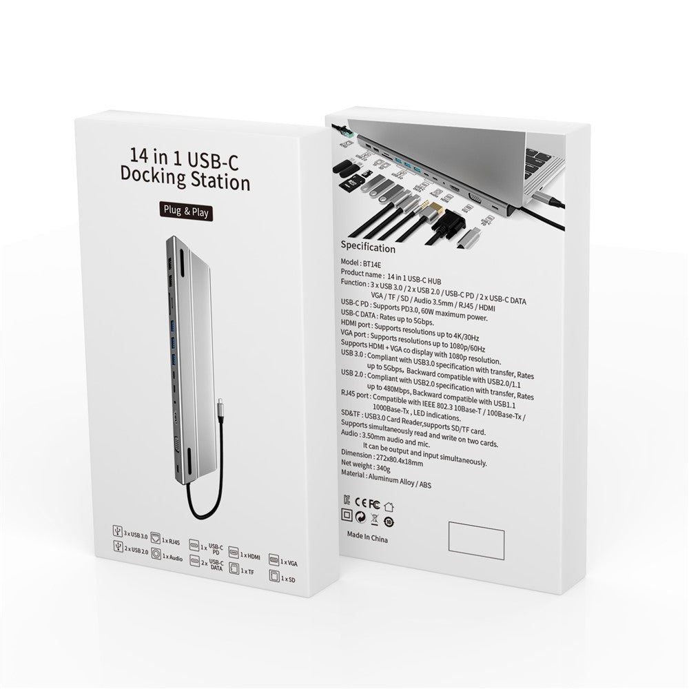 - 14-in-1 Versatile Expansion: This all-in-one docking station provides a complete solution for your connectivity needs. With 14 ports, including USB-C, USB 3.0, 4K HD, VGA, SD/TF card readers, and an Ethernet port, it enables seamless multitasking across multiple devices