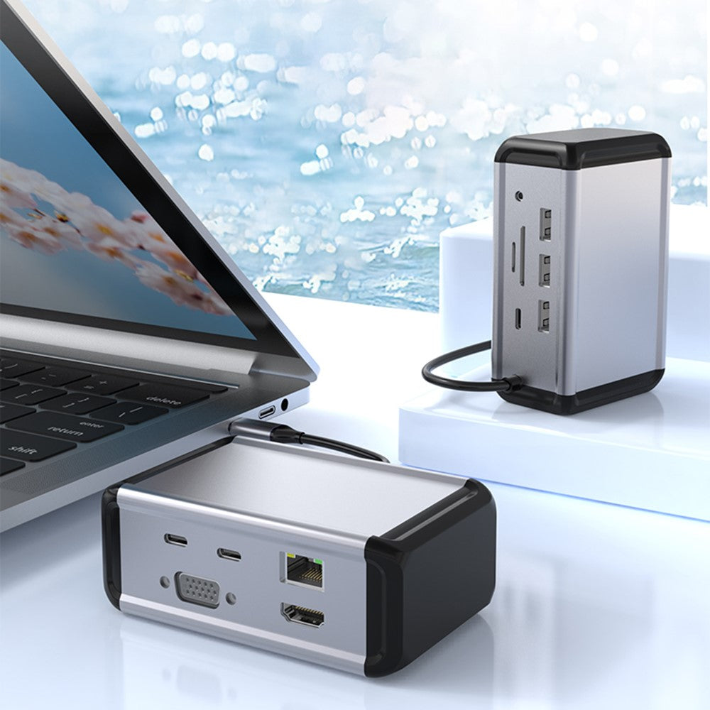 - Ultimate 12-in-1 Connectivity: This Type-C hub expands your laptop’s capabilities with 12 different ports, including HD, VGA, USB-C, USB-A, Ethernet, SD/TF card reader, and audio. Perfect for power users, this hub provides all the connectivity you need in one compact design