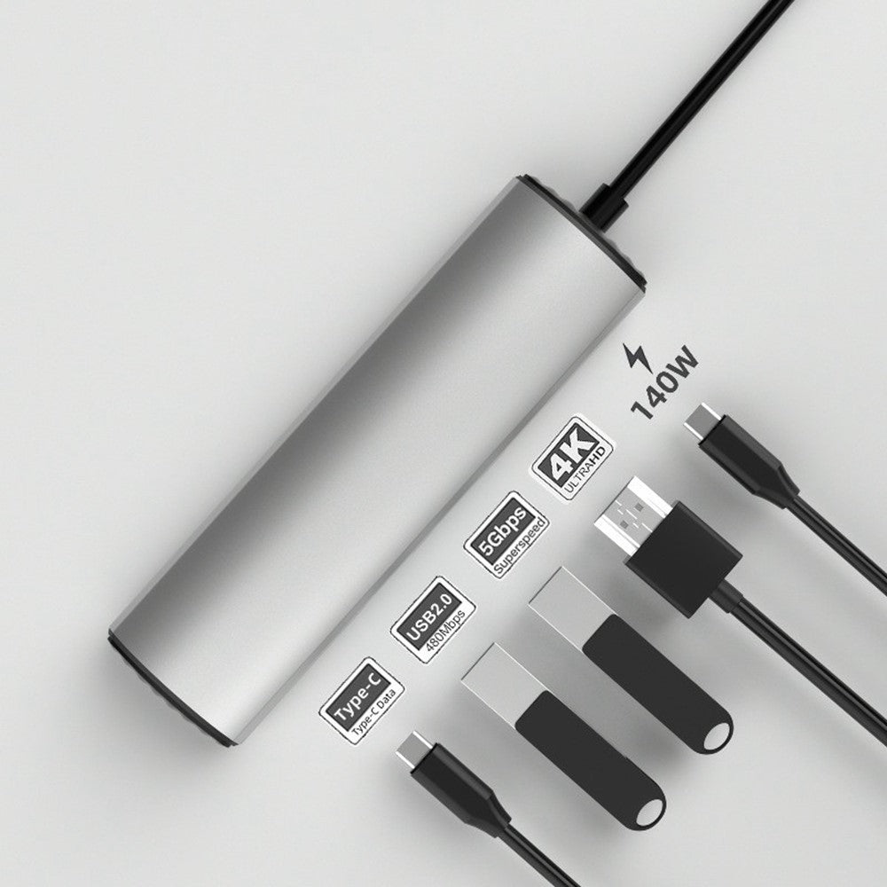 - 5-in-1 Type-C Hub: Features 5 ports, including USB-C PD 140W + 4K HD + USB3.0 + USB2.0 + USB-C3.0 port