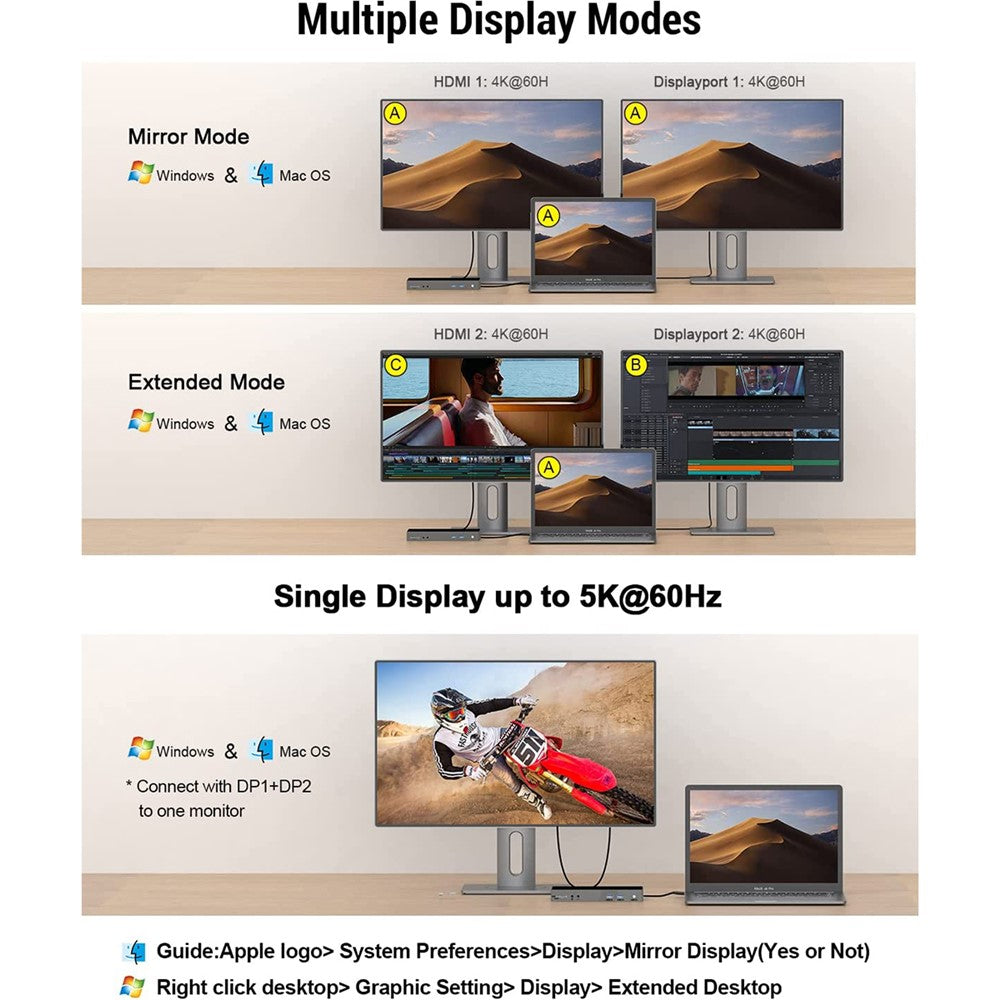 - 【High-Resolution Display Support】Dual 4K@60Hz output via HD and DisplayPort, enabling crisp and clear visuals for multiple monitors.