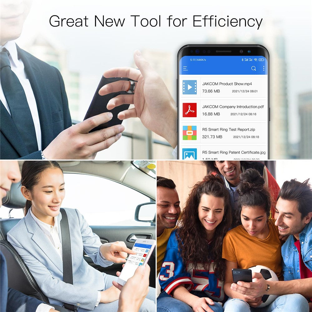- JAKCOM R5 is a multifunctional smart ring that can replace 6 proximity cards simultaneously, Social Sharing, Support Apple Shortcuts, Wireless Flash Disk, Virtual Call and SOS, Interact with mobile phones to realize special functions of "Social Sharing", "Wireless USB Flash Disk", "Smart Home Trigger" and so on