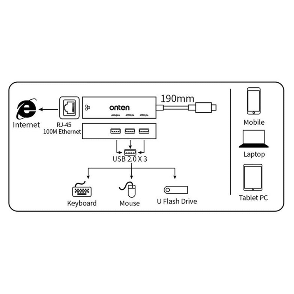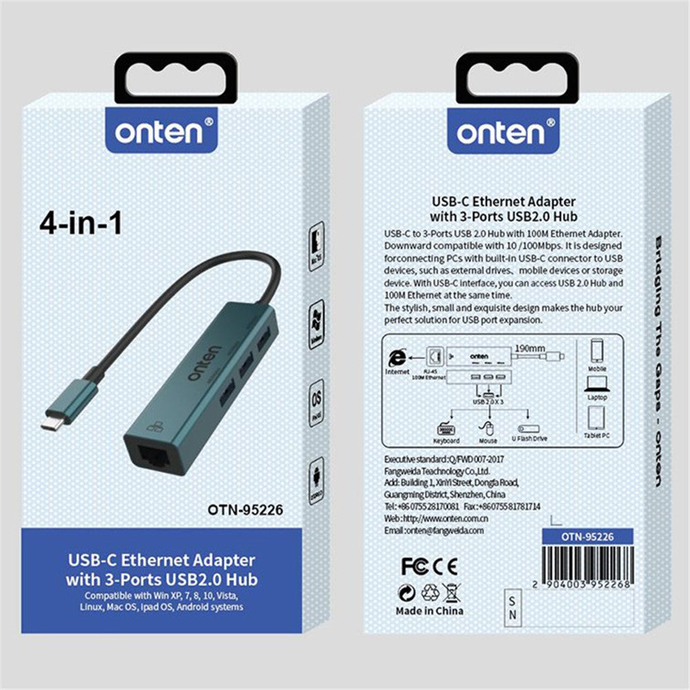 ONTEN 95226 Type-C to RJ45 + 3xUSB2.0 Ethernet Adapter USB Hub 4 in 1 Docking Station