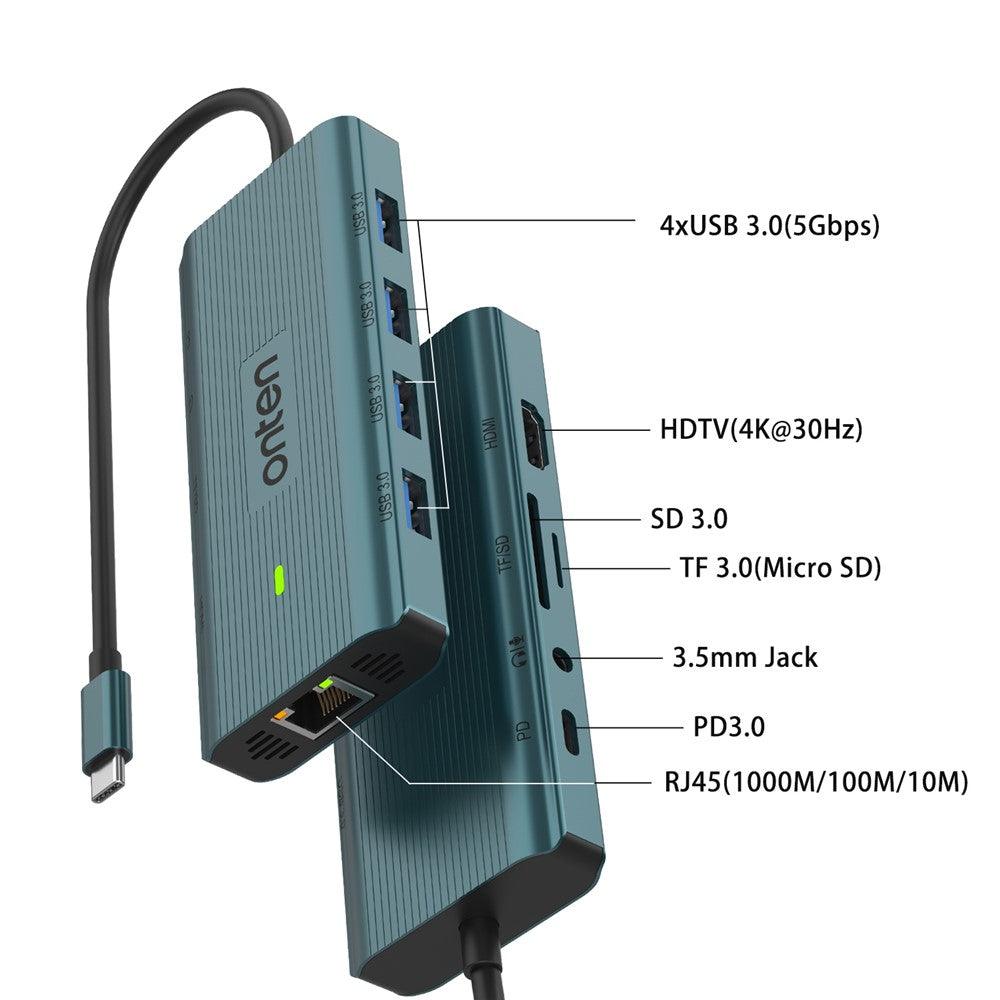 ONTEN UC962 10-in-1 Type-C to USB3.0*4+HD+SD+TF+Jack+PD 3.0+RJ45 USB Hub Docking Station