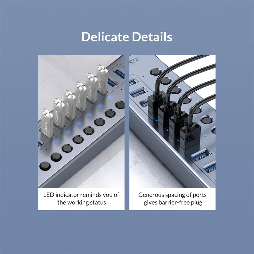 ORICO BT2U3-10AB Aluminum Alloy 10 Port USB3.0 5Gbps Data Transmission USB Hub Charging Splitter with Individual Switches