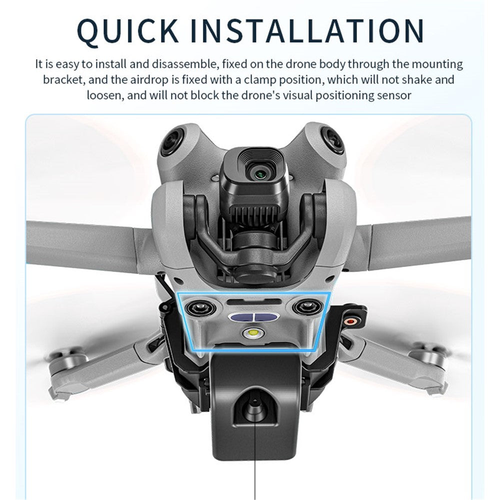- It is easy to install and disassemble. It is fixed on the fuselage through the mounting bracket. There are clips on the dispenser to prevent it from shaking loosening or blocking the drone's visual positioning sensor. The dispenser + mounting bracket totals 42.5g. The dispenser only Weighs 25g, so it will not affect the flight of the drone