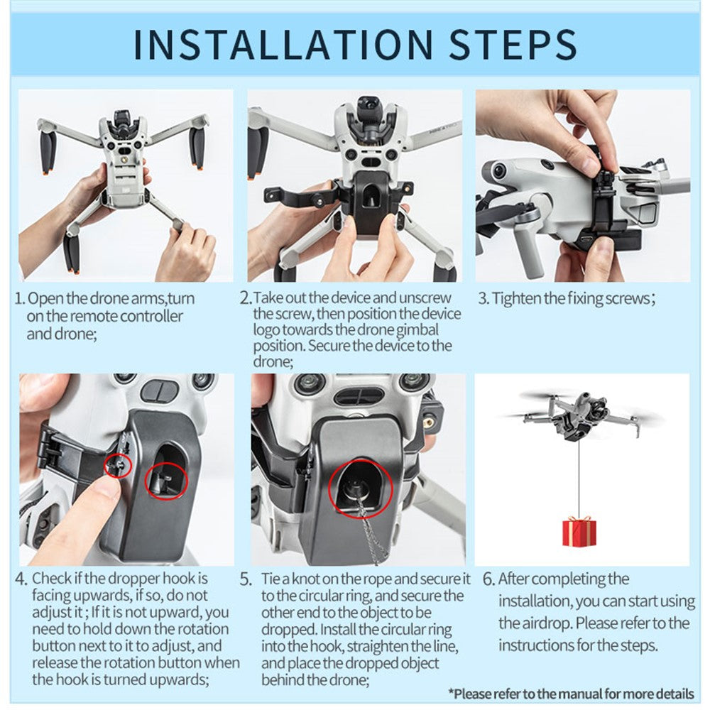 - The remote control drone delivery device is specially customized for the DJI Mini 4 Pro drone. The functions of the mounting bracket and the launcher are two-in-one (only one of the two functions can be used at the same time). The launcher can be separated from the mounting bracket. Objects can be dropped through the dispenser, and small items such as Go3 can be mounted through the 1/4 male screws of the mounting bracket (the dispenser can be removed first and then loaded)