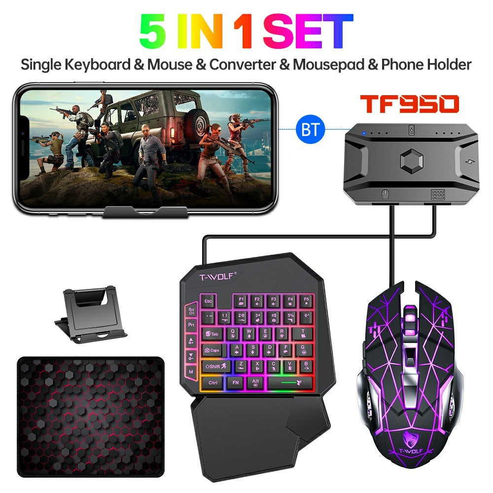 - 【Comprehensive Gaming Set】The T-WOLF TF950 offers a complete gaming solution with a 40-key one-handed keyboard, mouse, mobile phone converter, mouse pad, and phone holder.