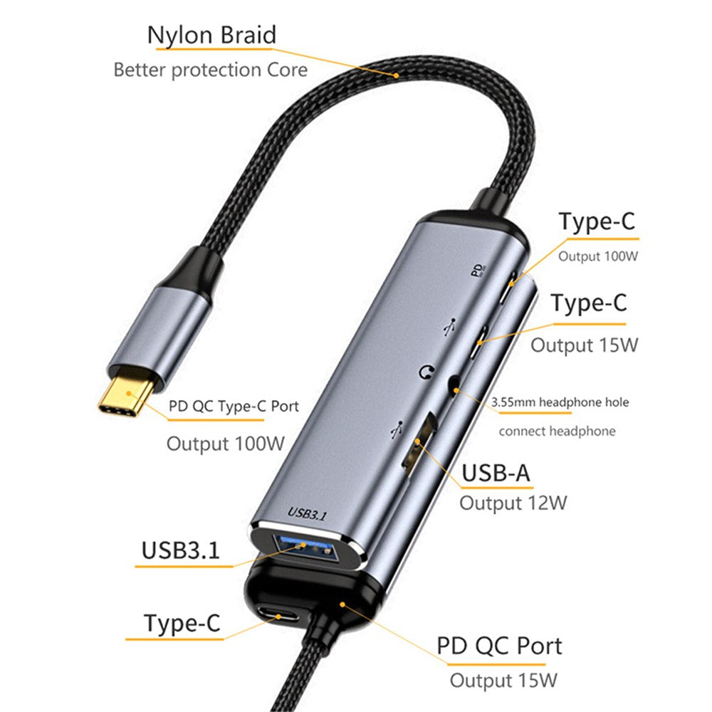 USB-C Hub Adapter Type-C to 2xUSB +Type-C+3.5mm Jack+ PD 100W Dock Station
