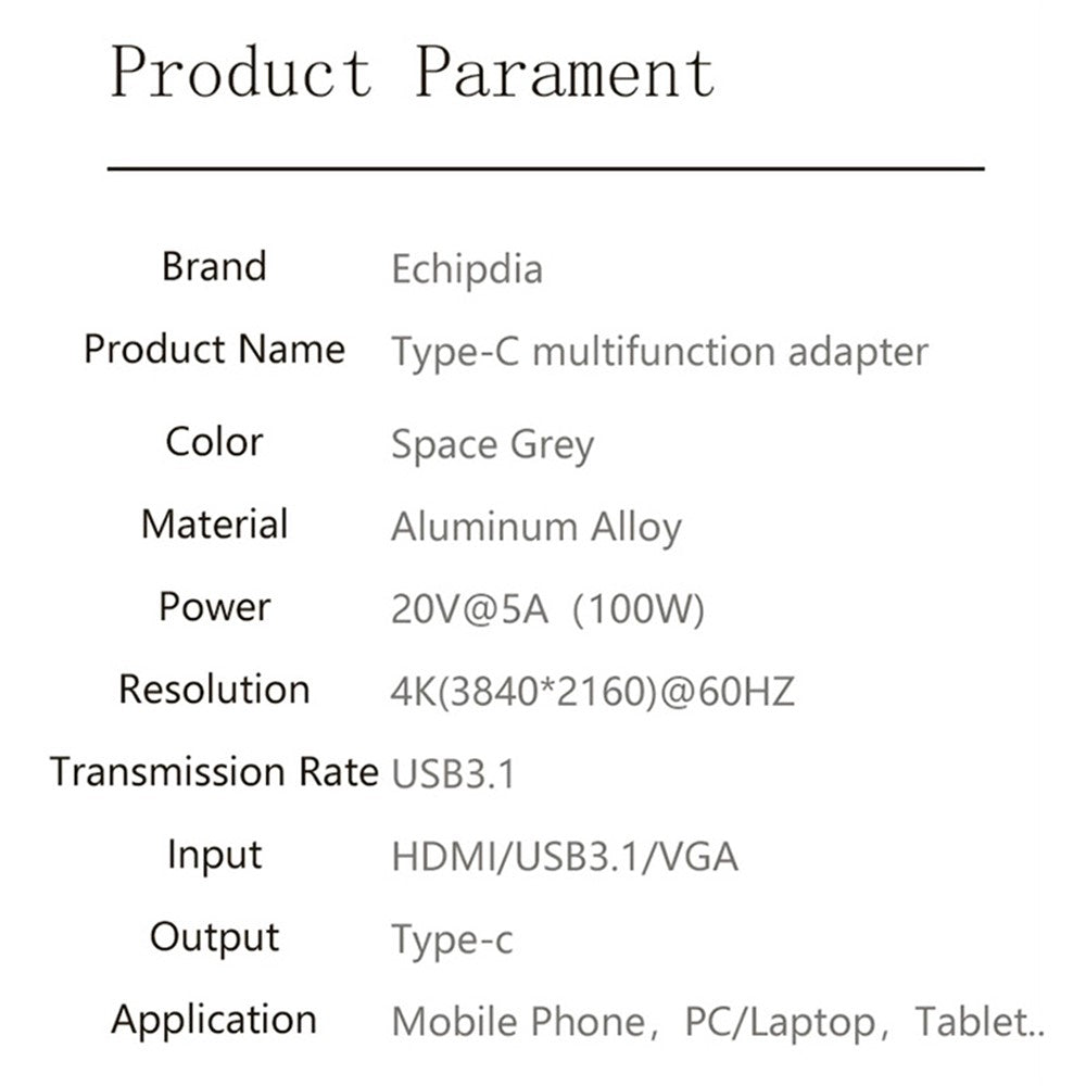 USB-C Hub Adapter Type-C to 4K 60Hz HD+USB 3.1+USB 2.0x2+USB 3.0+PD 100W Converter Dock
