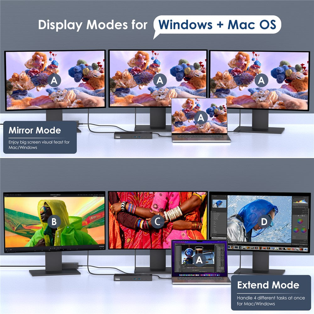 - Triple 4K@60Hz Display: With five video interfaces (2 DisplayPort + 2 HD + HD (Alt Mode)), you can simultaneously display content on three external monitors, with each screen showing different content, making multitasking a breeze. Supports triple display resolutions up to 3840x2160@60Hz with a DP1.4 source. Note: The HD (Alt Mode) port requires your laptop’s Type-C port to support video output