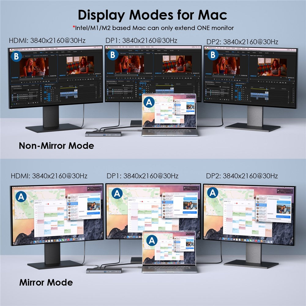 - Dual DP & HD Docking Station: With 2 DisplayPort ports and an HD port, the docking station can mirror or extend your screen to two or three monitors. When connecting a single monitor, the resolution is 4K@60Hz. For two monitors, the resolution is 4K@30Hz and 2K@60Hz (DP1.4). For triple displays, the resolution is 1080P. Note: For macOS, only mirror and non-mirror modes (A-BBB or A-AAA) are available