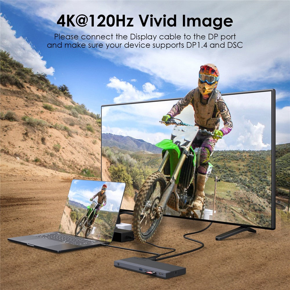 - 13-in-1 Laptop USB-C Docking Station: This docking station easily expands a single USB-C port into 2 DisplayPort, HD, 65W PD laptop charging (with 100W power adapter included), Gigabit Ethernet, 4 USB 3.0 ports, SD/TF card reader, and audio/microphone ports. It is compatible with all laptops featuring full-function USB Type-C/Thunderbolt 3/4 ports