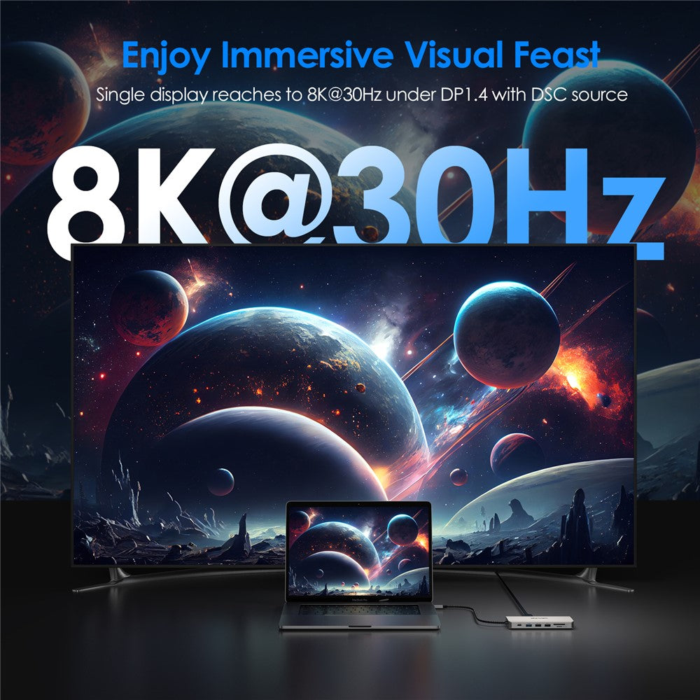 - Multi-ports Expansion: Equipped with 1 x HD (4K@60Hz under DP1.4) + 2 x DP ports (8K@30Hz/4K@144Hz with DSC) + 85W USB-C PD port + 2 x 10Gbps USB 3.1 + 2 x USB 2.0, 1 x 2.5Gbps RJ45 port + 2 card reader slots for SD / TF card (104MB/s) + 3.5mm audio port, providing huge peripheral connectivity, upgrading your workstation with a single USB-C port, greatly improving work efficiency