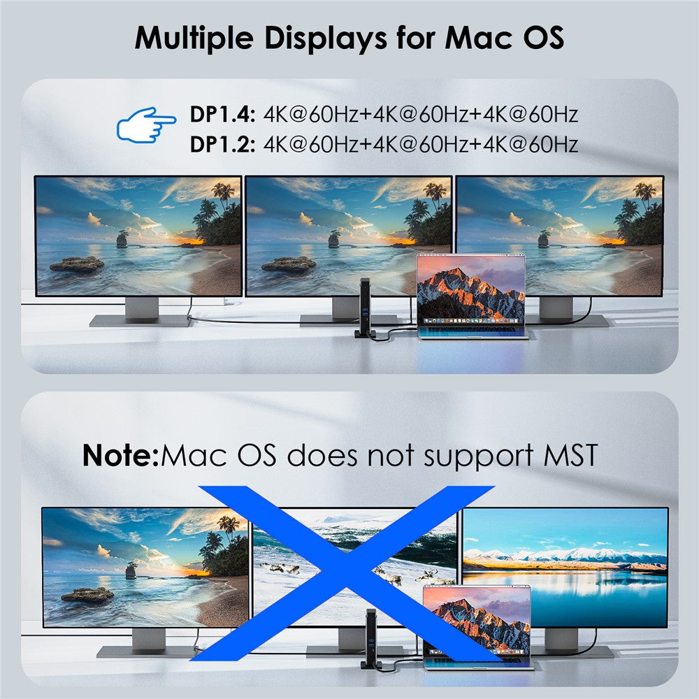 - [Plug-and-Play with No External Drivers Needed] For Macs do not support MST and can only extend to one additional screen (ABBB). Some Windows laptops may only support up to three displays (including the host screen) due to graphics card limitations