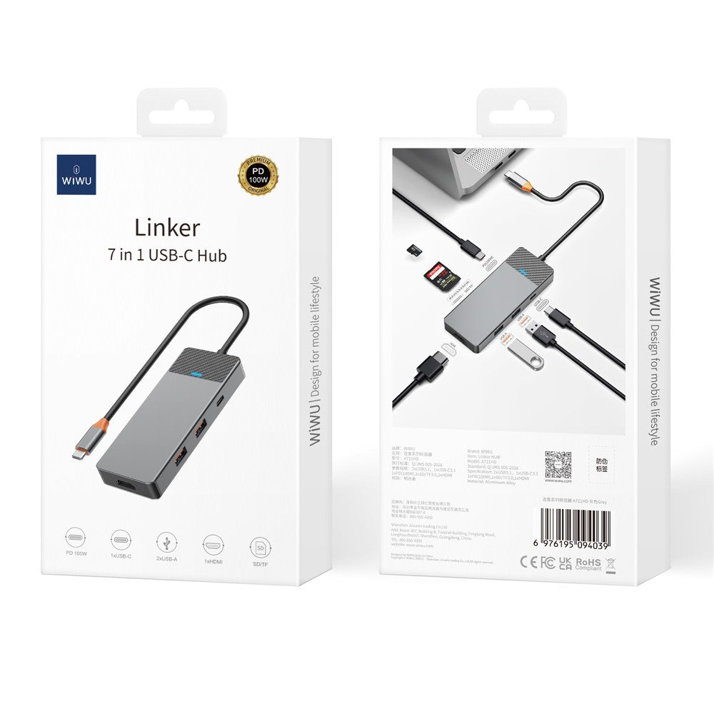 WIWU A721HD Type-C Hub Adapter to 2xUSB 3.1+PD 100W+USB-C+2xCard Reader Slots+HD Video Output