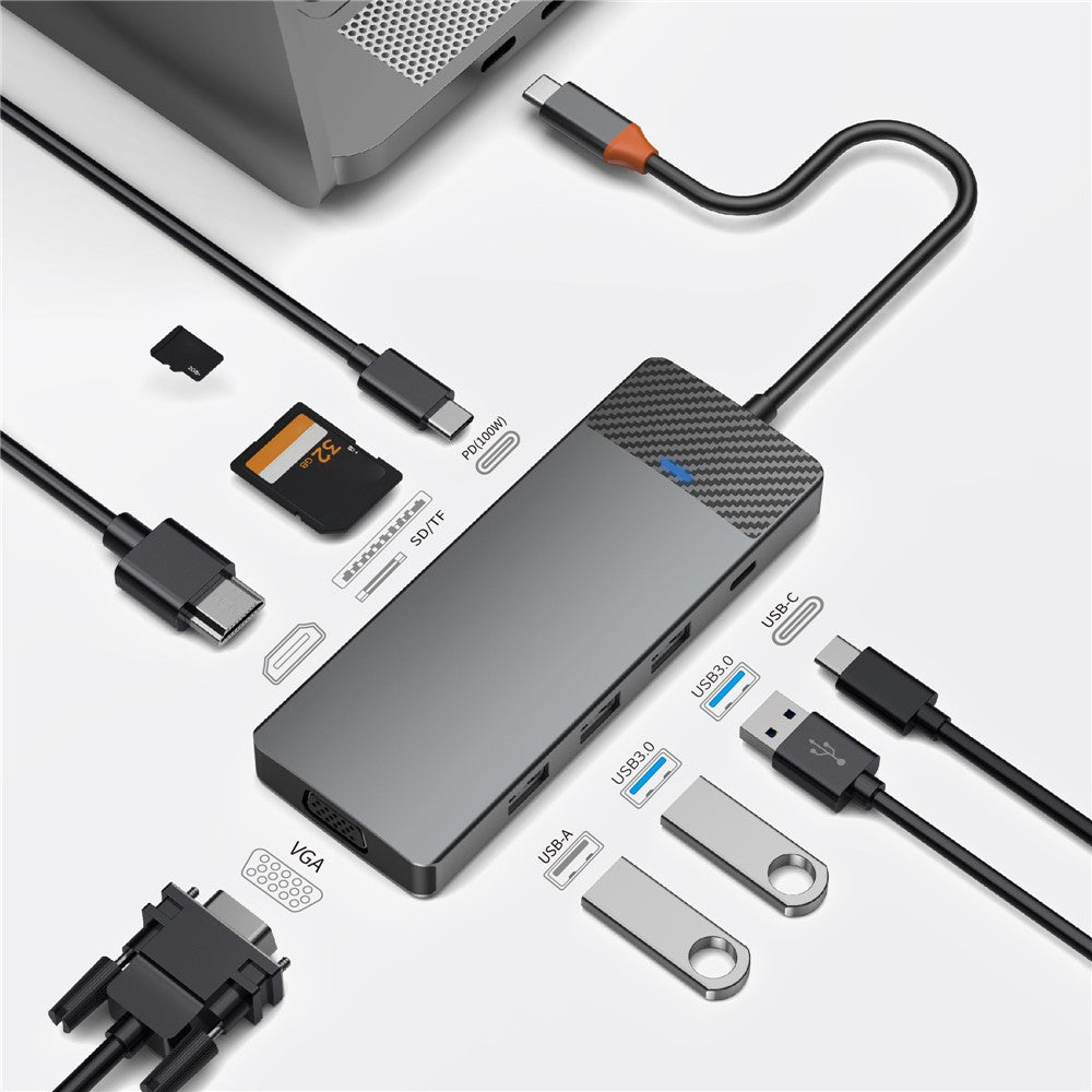 - This Type-C hub is equipped with USB 3.0*2+USB 2.0*1+SD/TF (3.0)+PD 100W+USB-C (3.0)+HD Video Output (4K@30Hz)+VGA (1080P)