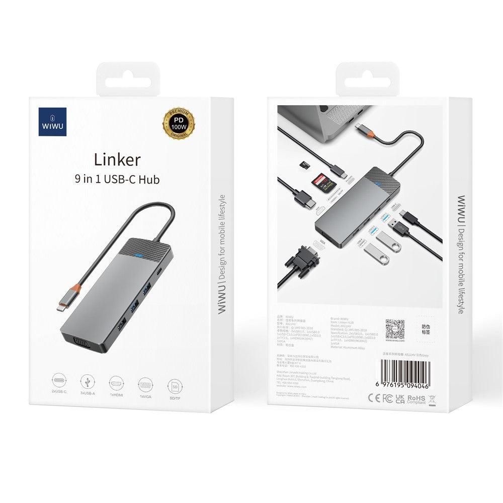 WIWU A921HV 9-In-1 Type-C Hub Multi-Port Converter with USB+PD+USB-C+Card Reader Slots+VGA+HD Output
