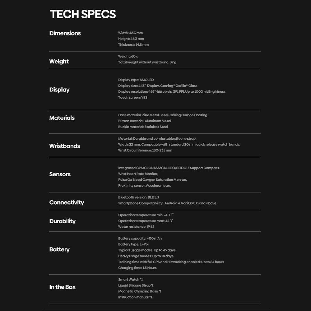 - With unprecedented visual clarity that reaches up to 391 ppi, the large 1.43-inch screen of the Zeblaze Stratos 3 Pro boasts a 83% screen-to-body ratio, and is visible even under bright sunlight